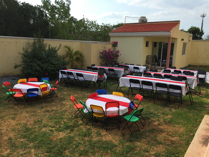 Para adultos e infantiles, redondas o rectangulares, sillas de adulto acojinadas, sillas infantiles de colores, manteles y caminos con colores a elegir.
